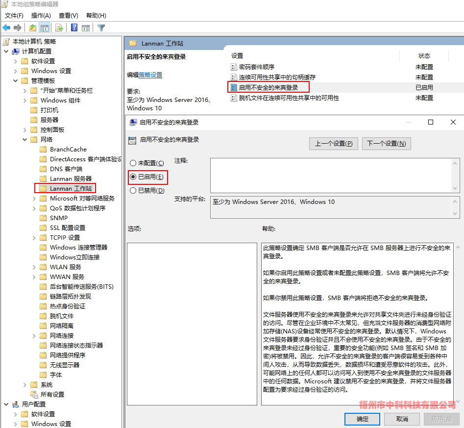 (3)計(jì)算機(jī)配置->管理模板->網(wǎng)絡(luò)->Lanman工作站->啟用不安全的來(lái)賓登陸->已啟用